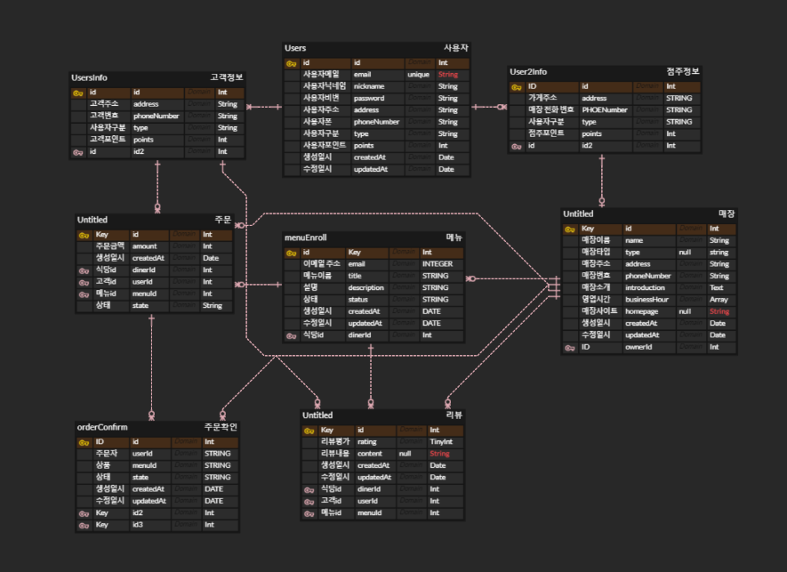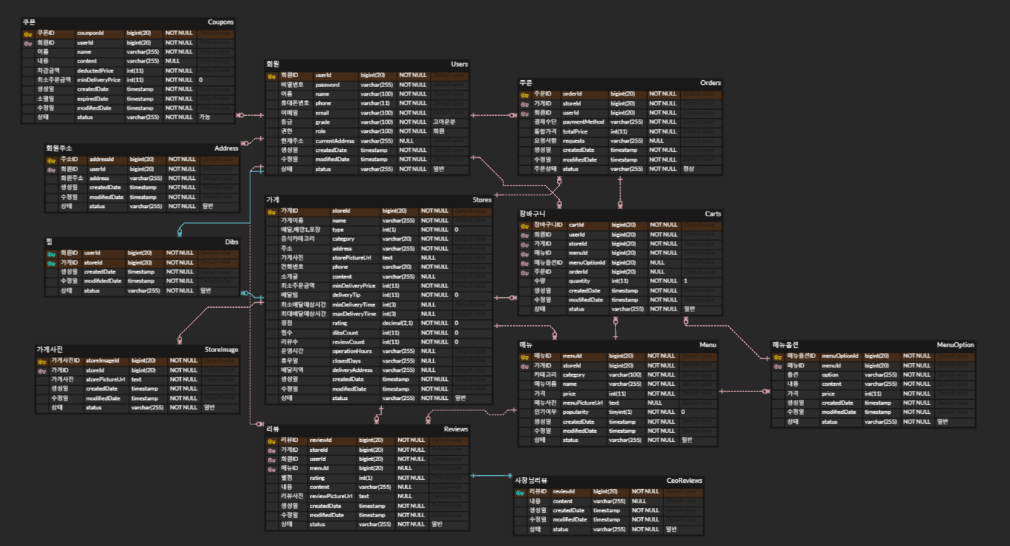 일관성 및 미흡 전체적으로 많이 미흡했고 따로 공부하고자 배달의 민족과 요기요의 ERD를 따로 찾아봤습니다. 확실히 사용자 측면에서 양방향적인 생각을 좀더 생각했어야하는데 거기까지 생각이 미치지 못해서 아쉬웠고 밑에 찾아본 ERD를 바탕으로 한 번 다시 설계를 해보면서 감을 잡아나가야겠습니다.