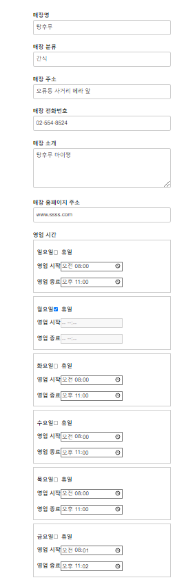 - “사장님”은 업장 정보를 등록 및 수정, 삭제를 할 수 있어야 합니다. (o: 등록 수정 삭제 가능)