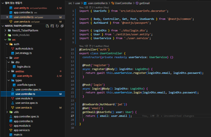 앞서 작성한 포스트에서 사용자의 컨트롤러 작업 준비를 마쳤습니다. 이번에는 Passport 라이브러리와 직접 제작한 JwtStrategy를 활용하여 안전하고 효과적인 사용자 등록 및 로그인 코드를 작성해보겠습니다. 이를 통해 Passport라이브러리와 직접 만든 JwtStrategy를 사용하여 JWT 인증이 된 사용자에게만 호출이 허용되는 getEmailAPI를 구현할 수 있습니다.