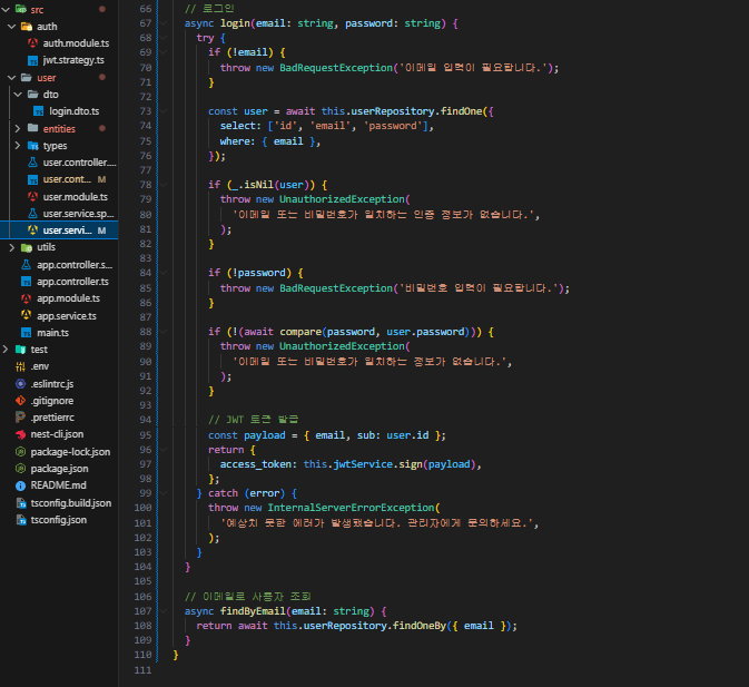 import { compare, hash } from 'bcrypt'; // bcrypt 라이브러리에서 비밀번호 해싱과 비교 함수 import import _ from 'lodash'; // lodash 라이브러리 사용 import { Repository } from 'typeorm'; // TypeORM 라이브러리에서 Repository import import { BadRequestException, ConflictException, Injectable, InternalServerErrorException, UnauthorizedException, } from '@nestjs/common'; // Nest.js에서 사용되는 예외 클래스들 import import { JwtService } from '@nestjs/jwt'; // JWT 서비스 import import { InjectRepository } from '@nestjs/typeorm'; // TypeORM에서 Repository를 주입하는 데코레이터 import import { User } from './entities/user.entity'; // User 엔터티 import @Injectable() export class UserService { constructor( @InjectRepository(User) private userRepository: Repository<User>, // User 엔터티의 Repository 주입 private readonly jwtService: JwtService, // JWT 서비스 주입 ) {} // 회원가입 async register(email: string, password: string) { try { // 이메일 형식 정규식 const emailRegex = /^[^\s@]+@[^\s@]+\.[^\s@]+$/; if (!email) { throw new BadRequestException('이메일 입력이 필요합니다.'); // 이메일이 없으면 BadRequestException 발생 } // 이메일 형식 검증 if (!emailRegex.test(email)) { throw new BadRequestException('올바르지 않은 이메일 형식입니다.'); // 이메일 형식이 아니면 BadRequestException 발생 } const existingUser = await this.findByEmail(email); if (existingUser) { throw new ConflictException('이미 등록된 이메일입니다.'); // 이미 등록된 이메일이면 ConflictException 발생 } if (!password) { throw new BadRequestException('비밀번호 입력이 필요합니다.'); // 비밀번호가 없으면 BadRequestException 발생 } if (password.length < 6) { throw new BadRequestException('비밀번호는 최소 6자 이상이어야 합니다.'); // 비밀번호가 짧으면 BadRequestException 발생 } // 비밀번호 해싱 및 사용자 저장 const hashedPassword = await hash(password, 10); await this.userRepository.save({ email, password: hashedPassword, }); } catch (error) { throw new InternalServerErrorException( '예상치 못한 에러가 발생했습니다. 관리자에게 문의하세요.', ); // 다른 예외가 발생하면 InternalServerErrorException으로 감싸서 처리 } } // 로그인 async login(email: string, password: string) { try { if (!email) { throw new BadRequestException('이메일 입력이 필요합니다.'); // 이메일이 없으면 BadRequestException 발생 } const user = await this.userRepository.findOne({ select: ['id', 'email', 'password'], where: { email }, }); if (_.isNil(user)) { throw new UnauthorizedException( '이메일 또는 비밀번호가 일치하는 인증 정보가 없습니다.', ); // 사용자가 없으면 UnauthorizedException 발생 } if (!password) { throw new BadRequestException('비밀번호 입력이 필요합니다.'); // 비밀번호가 없으면 BadRequestException 발생 } if (!(await compare(password, user.password))) { throw new UnauthorizedException( '이메일 또는 비밀번호가 일치하는 정보가 없습니다.', ); // 비밀번호가 일치하지 않으면 UnauthorizedException 발생 } // JWT 토큰 발급 const payload = { email, sub: user.id }; return { access_token: this.jwtService.sign(payload), }; } catch (error) { throw new InternalServerErrorException( '예상치 못한 에러가 발생했습니다. 관리자에게 문의하세요.', ); // 다른 예외가 발생하면 InternalServerErrorException으로 감싸서 처리 } } // 이메일로 사용자 조회 async findByEmail(email: string) { return await this.userRepository.findOneBy({ email }); // 주어진 이메일로 사용자 조회 } }1. register 메서드