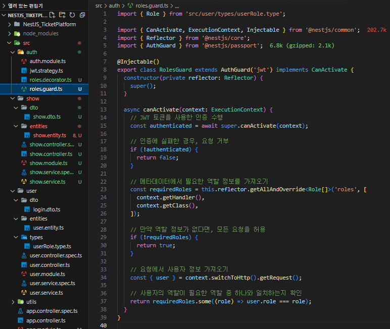 src/auth 디렉토리로 이동한 후 roles.guard.ts 파일을 생성하고 코드를 작성합니다.