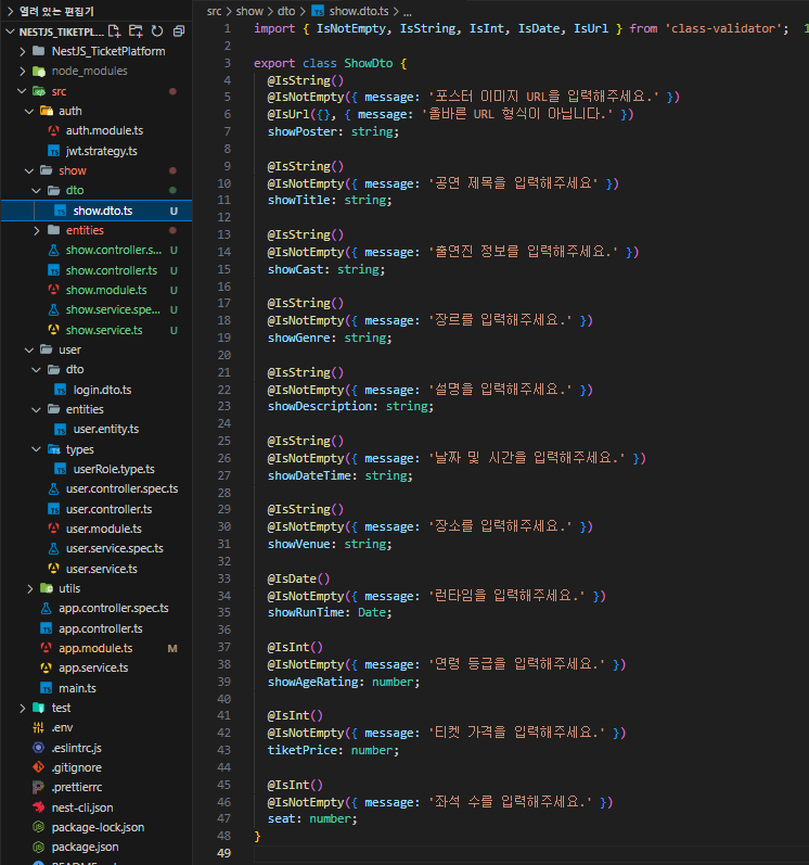Show ntity 작업이 완료되면 다음으로 show.controller에서 사용할 DTO 파일도 만들어야합니다. rc/show 디렉토리로 다시 이동하여 dto디렉토리를 생성한 후 show.dto.ts 파일을 새롭게 만들어 작성해야합니다.