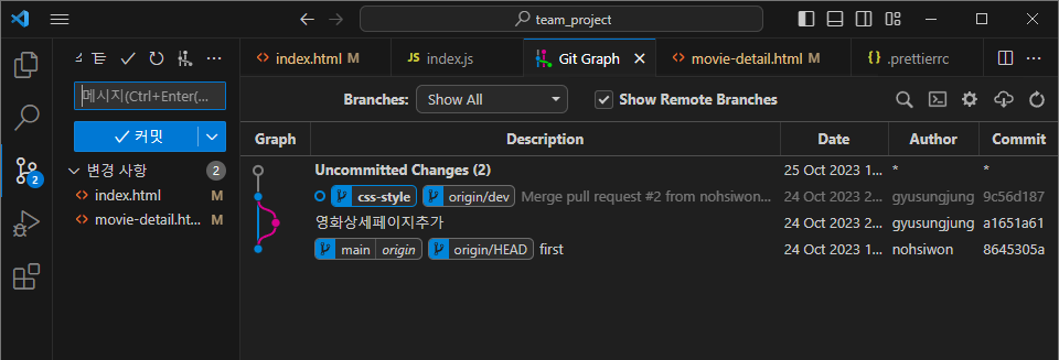 오늘 주말 동안 지겹게 했건 git 사용을 하다가 오류가 떠서 막혀보기도 하고, 질문하며 문제도 풀고 특강도 들었다. 마지막에는 튜터님을 퇴근을 못 할 정도로 질문하면서 괴롭혔는데 끝까지 친절하게 설명해 주신 b반 튜터님께 너무 감사했다. 덕분에 prettier와 git graph를 활용할 수 있는 방법을 자세히 배울 수 있었고 분명 오늘은 1% 이상 성장한 소중한 하루였을 것이다.// prettier 설정방법 _ 설치 후 세팅 변경