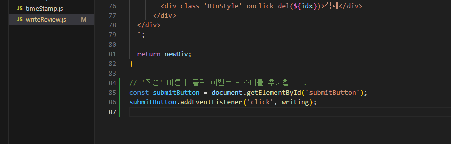 작동 부분을 지우고 id 값을 준 다음 js파일로 넘어감