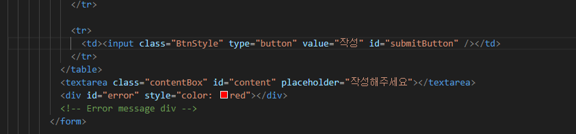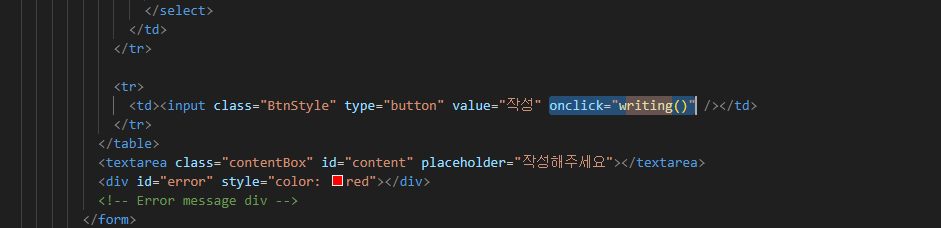 html에서 이전에 작업한 글 작성 버튼 on click 버튼이 like Dislike 버튼을 만들고부터는 실행이 안 되는 오류가 발생했습니다. 이전부터 심심하면 한 번씩 작성 등록이 적용되었다가 실패하는 오류가 있었습니다. 처음에 코드상 열심히 찾아봐도 원인이 없다고 생각해서 두 시간은 헤맸습니다.