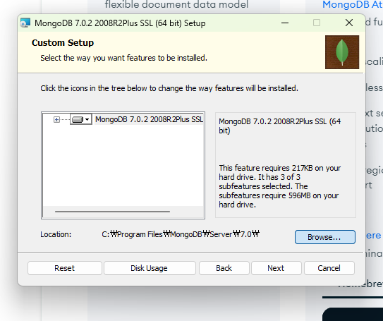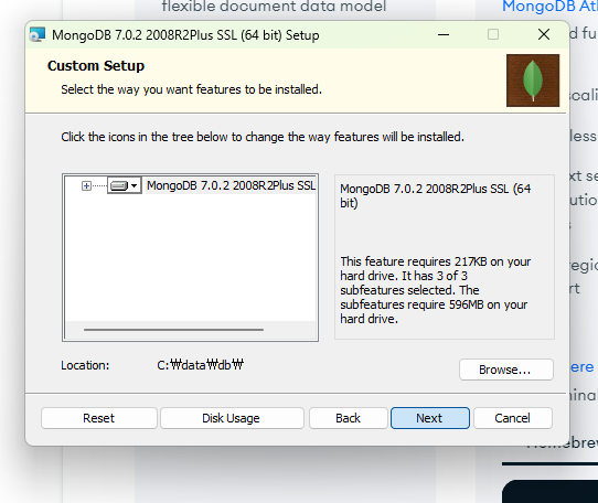 Location 항목이 C:\data\db\ 로 변경된 것을 확인하고 Next를 클릭합니다.