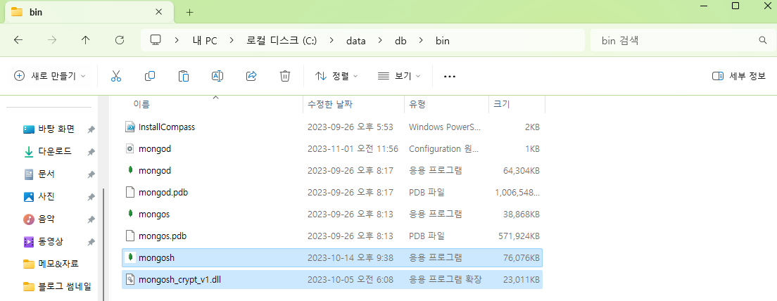 그리고 압축을 풀고 bin 폴더로 들어가면 mongosh 파일과 함께 또 다른 파일 하나가 있습니다.