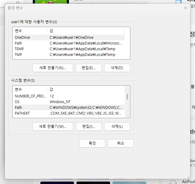 환경변수 > [시스템 변수] 목록 > Path 선택 > 편집을 클릭한 뒤 다음 내용을 추가합니다.