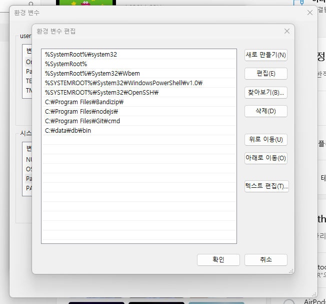 C:\data\db\bin을 추가합니다.