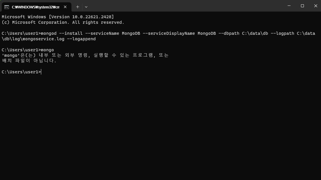 "mongo"은(는) 내부 또는 외부 명령, 실행할 수 있는 프로그램, 또는 배치 파일이 아닙니다. 라고 뜹니다.