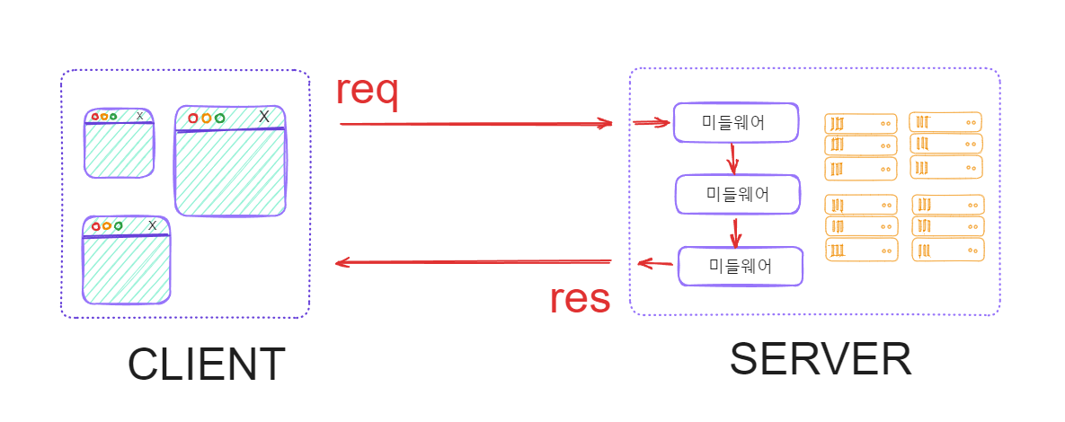 클라이언트에서 요청을 보내게 되면 서버에 있는 미들웨어들이 동작을 하게 됩니다. 요청이 들어오자마자 첫 번째 미들웨어를 거치게되고 미들웨어들 하나하나를 다 타고 들어가서 최종 미들웨어에서 응답을 보내면 그 응답이 클라이언트에게 전달되는 구조이며, 응답이 마무리될 때까지 미들웨어 동작 사이클이실행됩니다. 즉 서버가 모든 미들웨어들의 호출로 구성되어 있다는 것을 예측할 수 있게 됩니다.