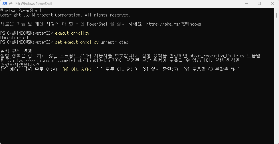 2. 관리자 권한으로 실행 후 1. executionpolicy를 입력해줍니다.