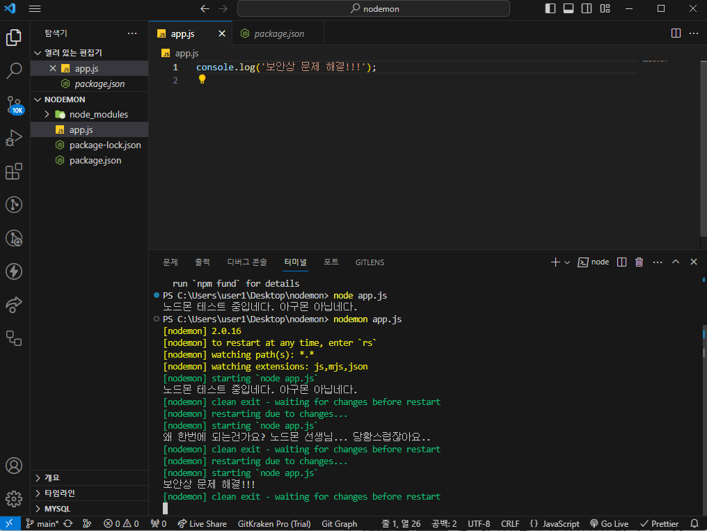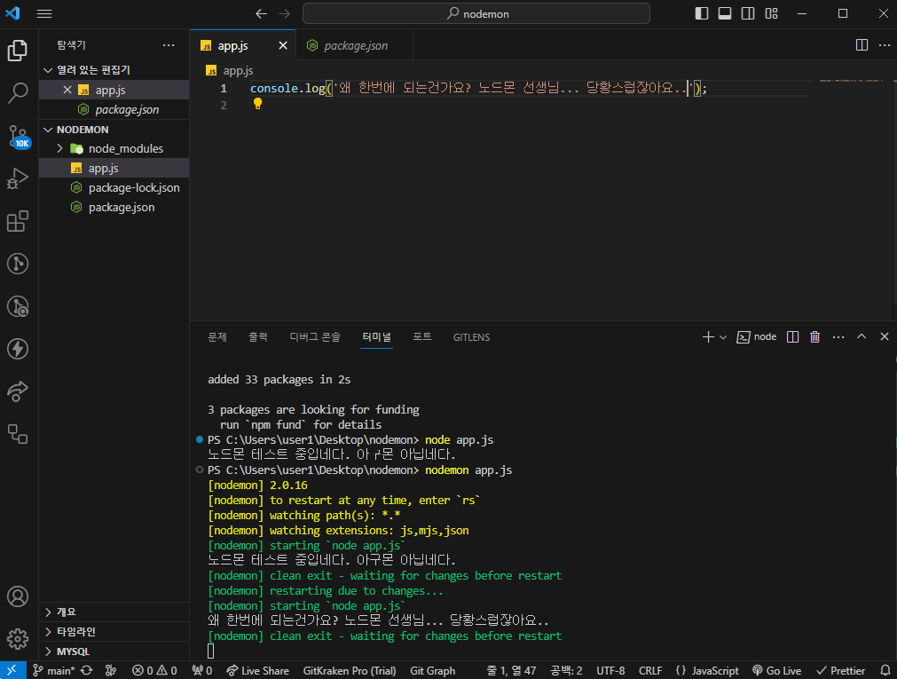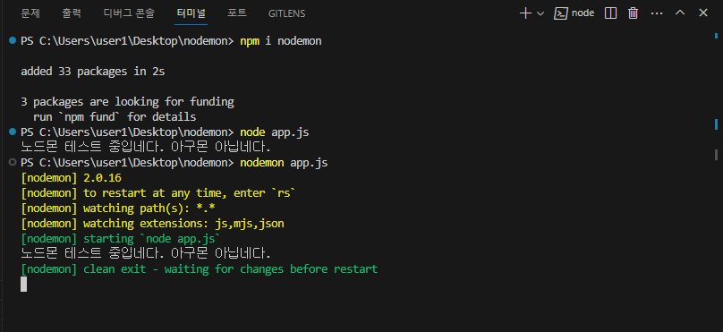 5. 다시 VSC로 돌아와서 nodemon.js를 실행해줍니다. 정상적으로 실행이되면 코드를 변경하는 순간 nodemon이 서버를 재 시작해줍니다.
