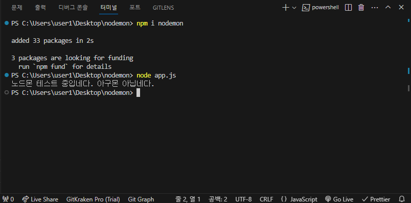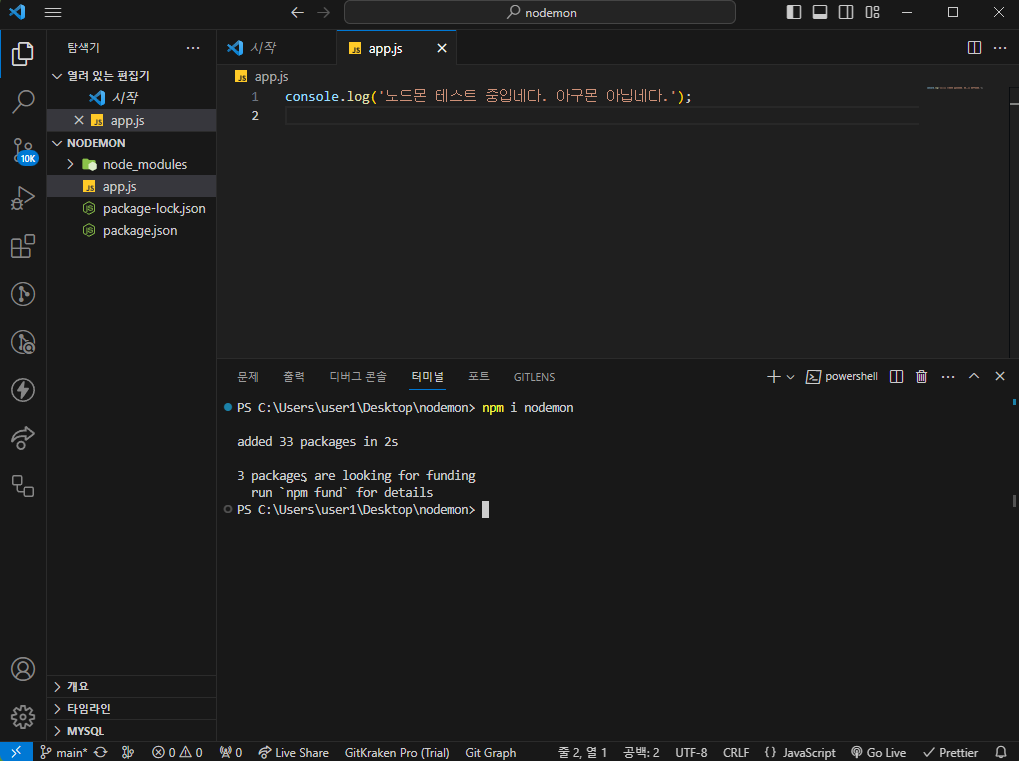 # nodemon 설치가 완료되고 테스트 전 node.js를 실행해줍니다.