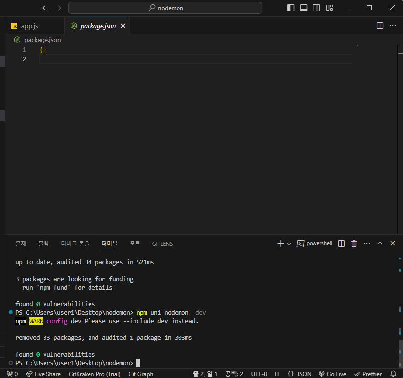 만약 다운받은 npm 모듈을 삭제하고 싶다면? 기존 install 명령을 uninstall로 바꿔주시면 삭제를 할 수 있습니다.