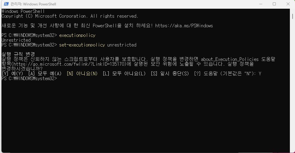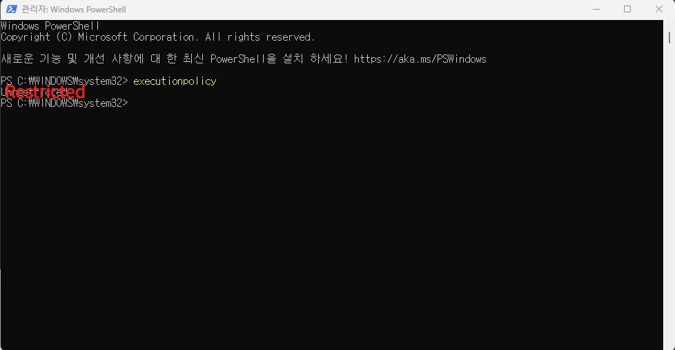 2. 관리자 권한으로 실행 후 1. executionpolicy를 입력해줍니다.