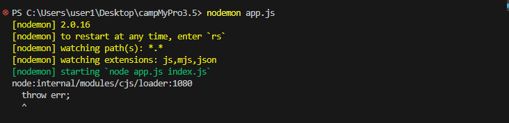 "scripts": { "dev": "nodemon app.js", },이후 nodemon을 실행 시키면 실행은 되는 것을 확인할 수 있습니다.