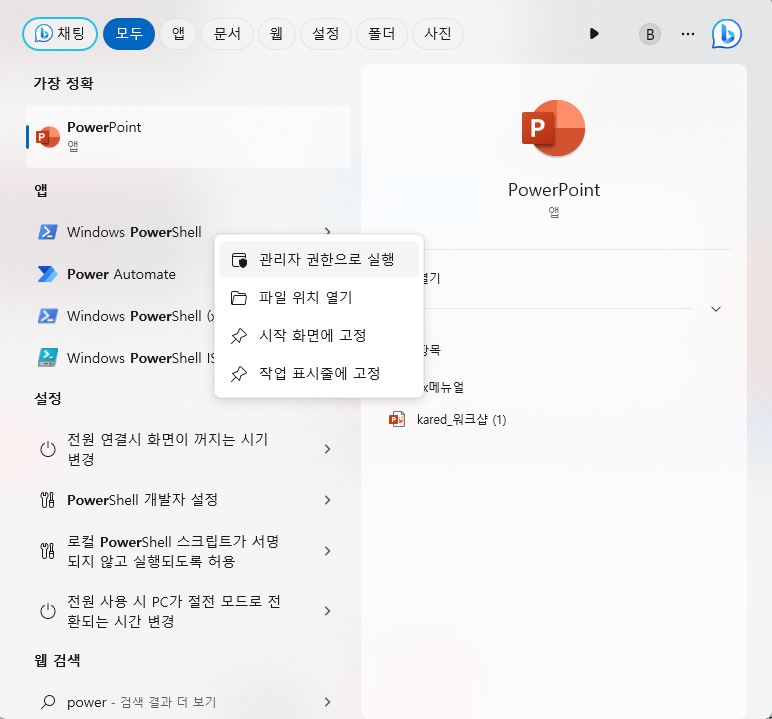 1. 시작페이지에서 검색으로 powerShell을 찾아서 관리자 권한으로 실행해줍니다.
