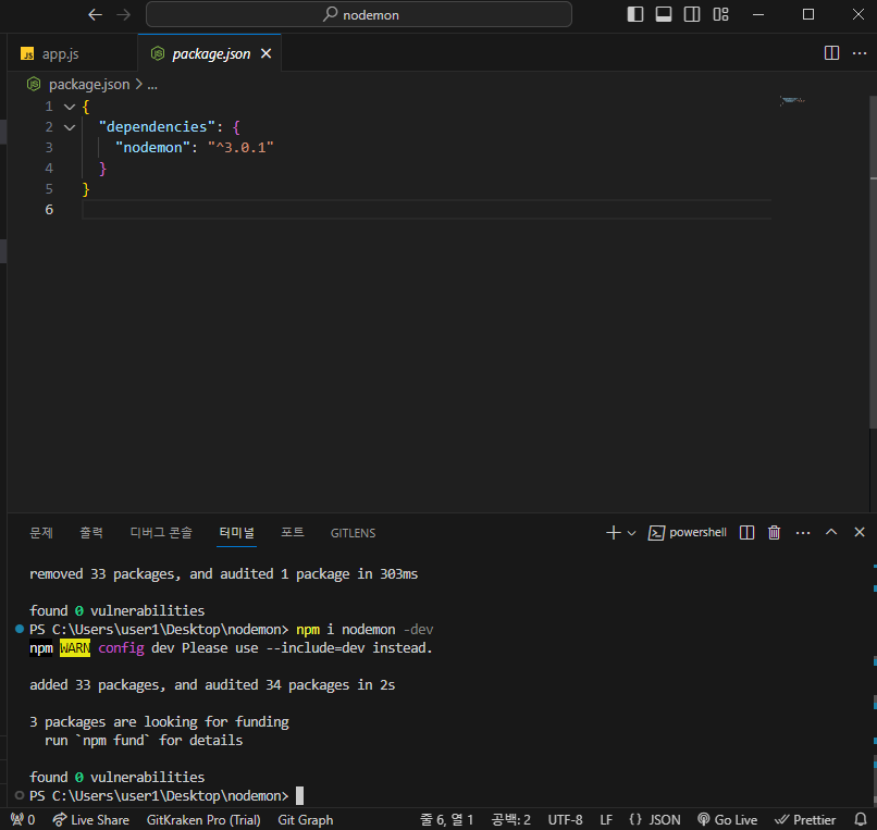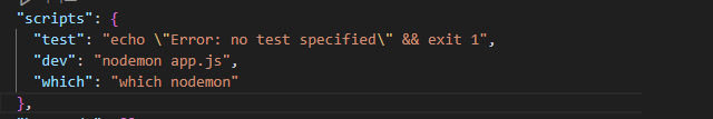 "scripts": { "dev": "nodemon app.js", "which": "which nodemon" },which 명령어는 설정된 PATH를 조회하기에 packege.json scripts에 추가 설정을 했습니다.