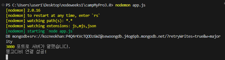 # 그럼 노드몬을 실행해 줍니다.