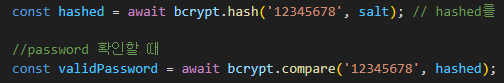 ** 비밀번호 만들고 암호화 하기//password 확인할 때, 위의 내용과 이어짐... // 새로 입력한 비밀번호가, 암호화 된 비밀번호와 일치하는지 확인하기 const validPassword = await bcrypt.compare('12345678', hashed); // 비밀번호가 일치하면 true, 일치하지 않으면 false를 반환한다. console.log("비밀번호 일치 여부 : "validPassword);