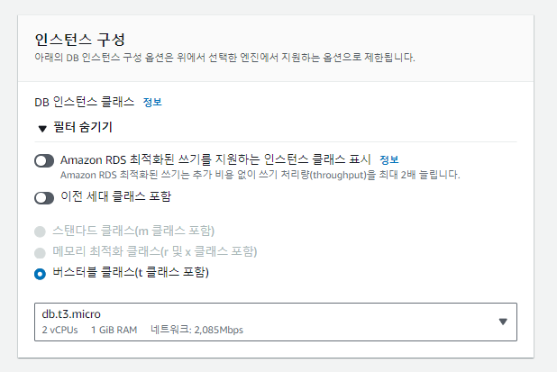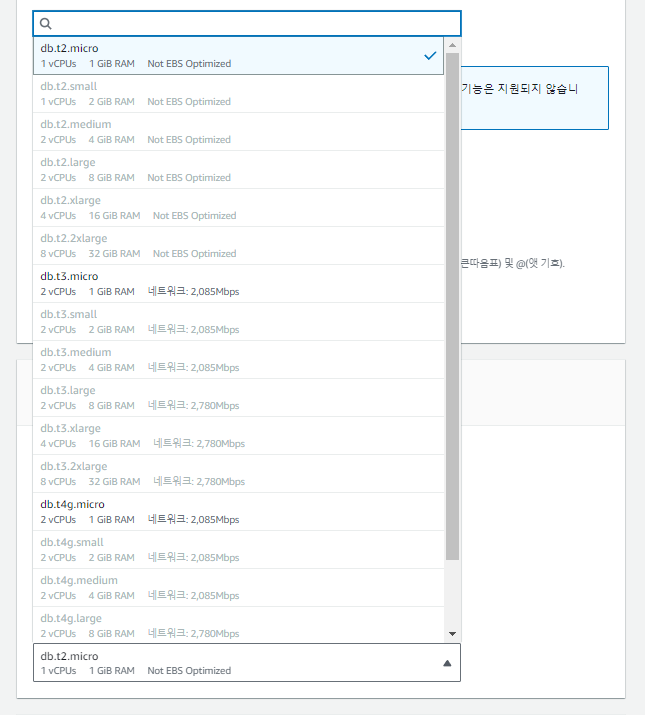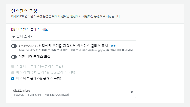 ** 인스턴스 구성 데이터 베이스 성능 선택 부분에서 db.t3.micro를 -> 대표적으로 많이 사용하는 db.t2.micro로 변경해줍니다. db.t3.micro도 프리티어가 지원되기는 하지만 t3부터 vCPUs 하나당 별도의 요금이 부과되는 경우가 발생한다고 합니다.