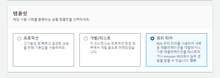 ** 템플릿 선택은 프리티어로 선택합니다. 안그럼 요금이 부과될 수 있습니다.