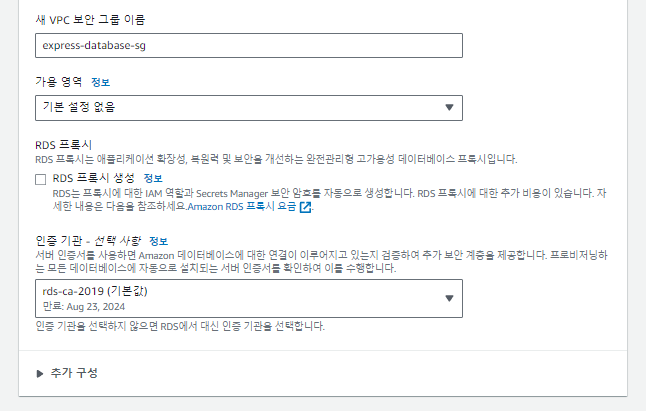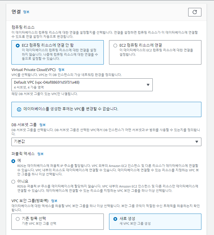 ** 퍼블릭 엑세스 예 선택 후, VPC 보안 새로 생성을 클릭 한 후 새 VPC보안 그룹 이름을 작성해줍니다.