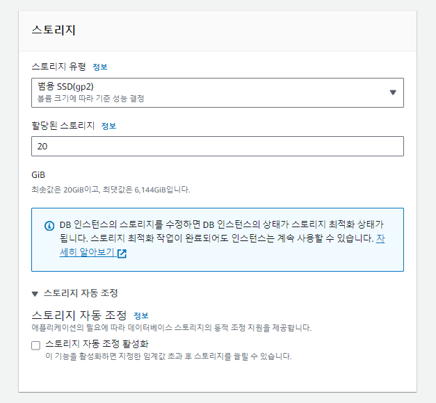 ** 최소 스토리지 20으로 확인 후 스토리지 자동 조정 활성화를 OFF합니다.