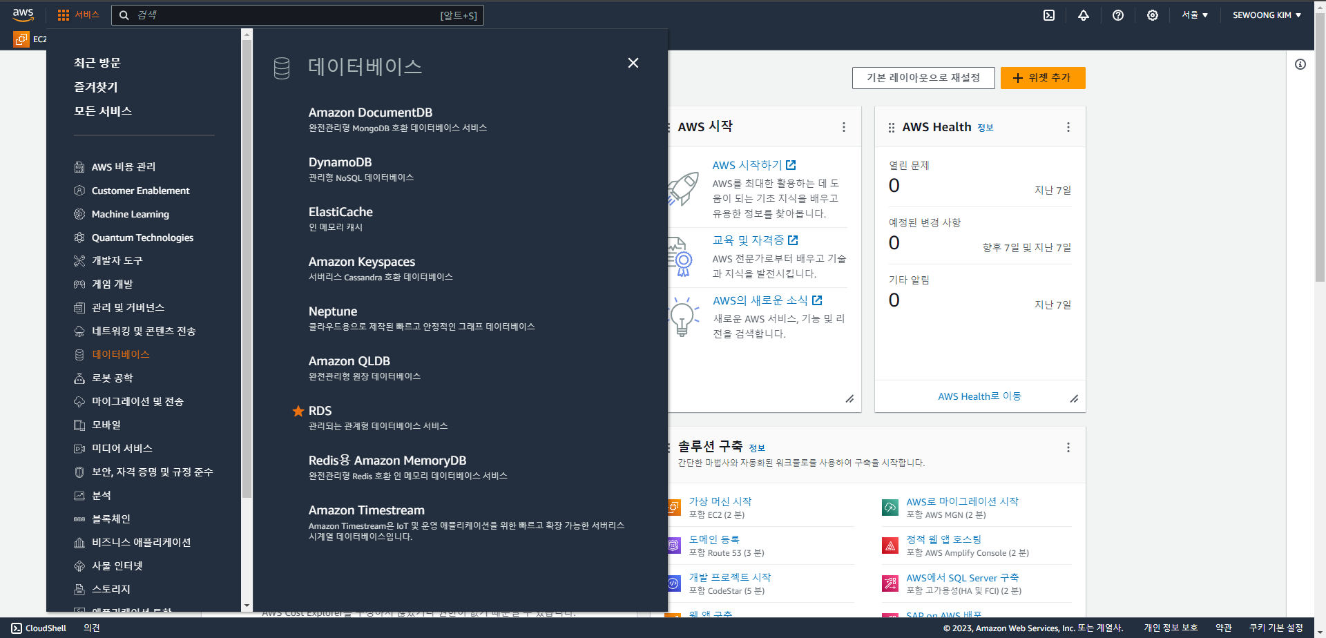 ** 메인 페이지 왼쪽 상단에 서비스 클릭 -> 데이터베이스 -> RDS 순으로 들어갑니다.