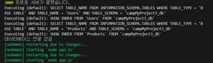 // DB연결 확인하기 const SERVER_PORT = process.env.PORT || 3000; // const SERVER_PORT = 3000; const { sequelize } = db; sequelize .sync({ force: false }) .then(() => { console.log('데이터베이스 연결 성공'); }) .catch((error) => { console.log('데이터베이스 연결 실패: ', error); }); app.listen(SERVER_PORT, () => { console.log(SERVER_PORT, '포트로 서버가 열렸습니다.'); });