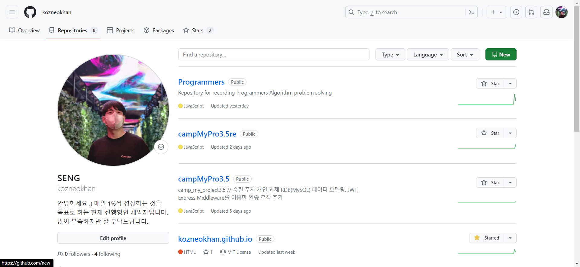 좌측 상단의 New를 클릭하여 Repository를 생성하셔도 되고, 화면을 못찾으시겠다면 우측 프로필을 클릭하여 Your repositories > 이동한 페이지 우측 상단 New를 클릭해서 생성하셔도 됩니다.