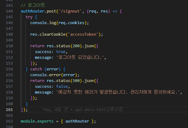 5. 로그인(/signin) 라우트res.cookie('accessToken', accessToken, { httpOnly: true });로그인 시, res.cookie()를 사용하여 클라이언트에게 accessToken이라는 이름의 쿠키를 설정하고 있습니다. httpOnly: true 옵션을 통해 JavaScript로 쿠키에 접근하는 것을 방지하고, 서버와 안전하게 통신할 수 있도록 합니다.