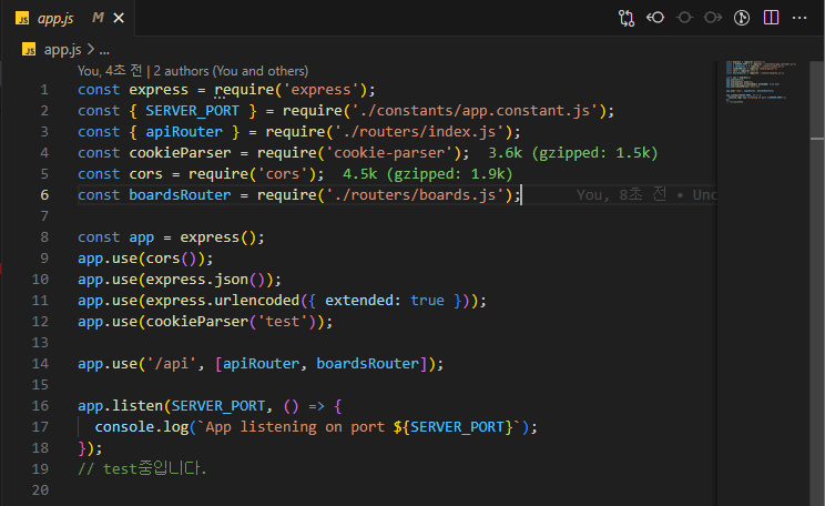 2. app.js에서 모듈을 먼저 불러옵니다.const cookieParser = require('cookie-parser');cookie-parser 모듈을 require() 함수를 통해 불러옵니다. 이를 통해 Express 애플리케이션에서 쿠키를 파싱할 수 있는 기능을 사용할 수 있습니다.
