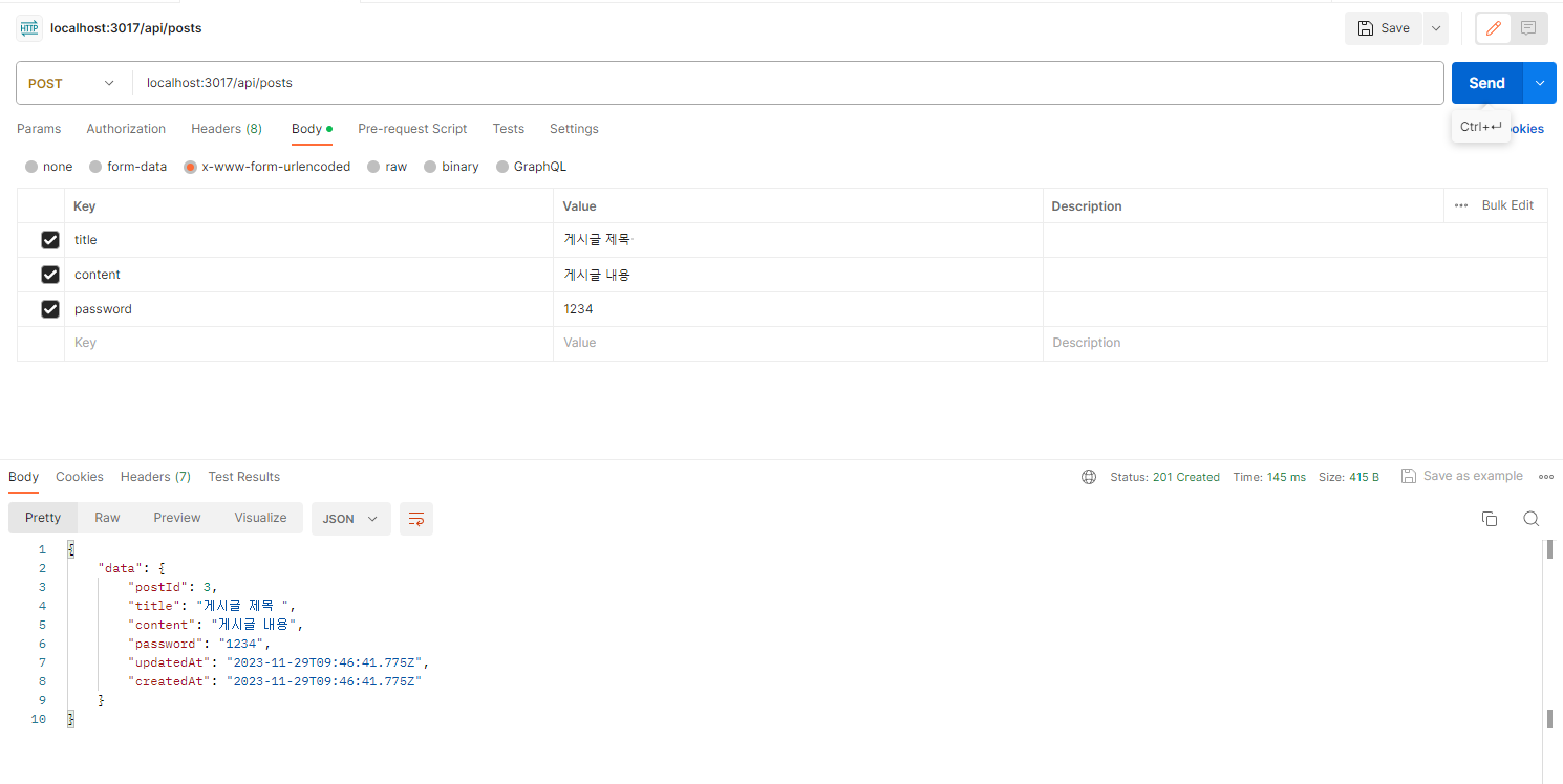 ** HTTP POST메소드를 사용하여 localhost:3017/api/posts 값을 주고 Body > raw > JSON 선택 후에 JSON 형태로 작성 > Send 클릭