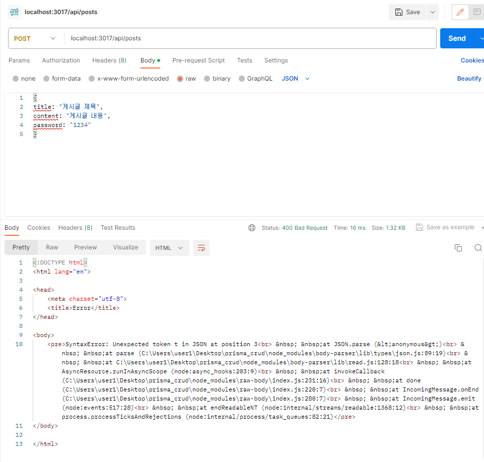 ** JSON형태로 결과 값이 나오기를 기대했지만 실패 > VSCode 확인(SyntaxError:Unexpected token t in JSON at position 3 발생)