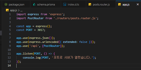 ** VSCode로 돌아가서 app.js 에 코드 한 줄을 추가해줍니다.