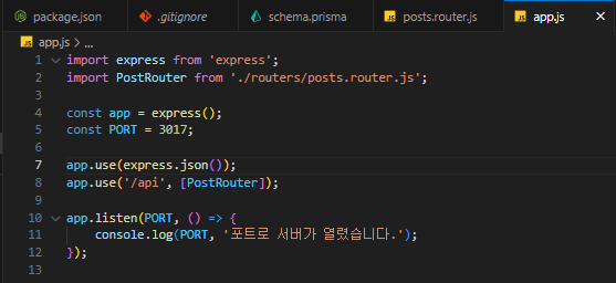 ** VSCode로 돌아가서 app.js 에 코드 한 줄을 추가해줍니다.