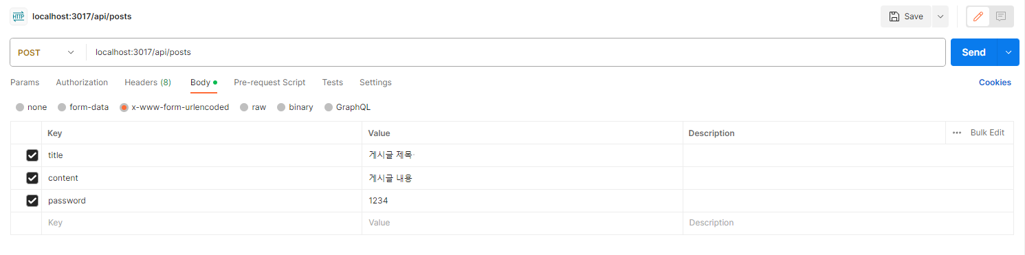 Body 메뉴에서 기존에 JSON 형식으로 작성했던 내용을 x-www-form-urlencoded 형식으로 변경합니다. 이를 위해 Body 메뉴 안에서 x-www-form-urlencoded 옵션을 선택하고, key-value 형태로 데이터를 작성합니다.