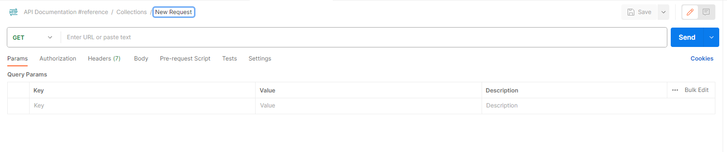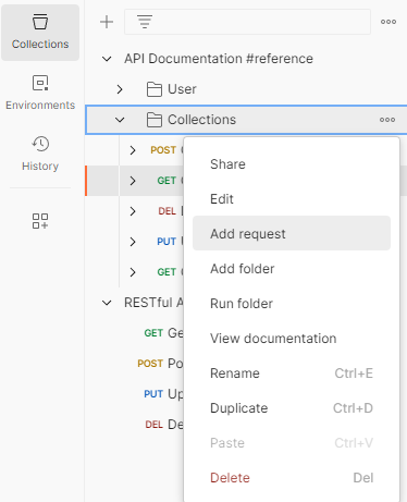 ** 왼쪽 상단에 Collections 클릭 > Collections 우클릭 > Add request 선택 > New Request 생성