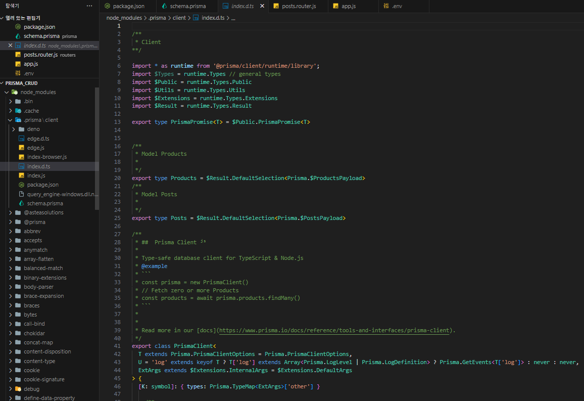 ** node_modules > .prisma > client > indexedDB.d.ts 확인