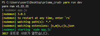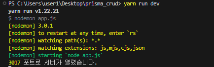 # express, prisma, @prisma/client 라이브러리를 설치합니다. yarn add express prisma @prisma/client