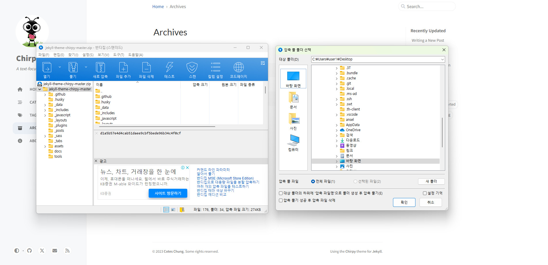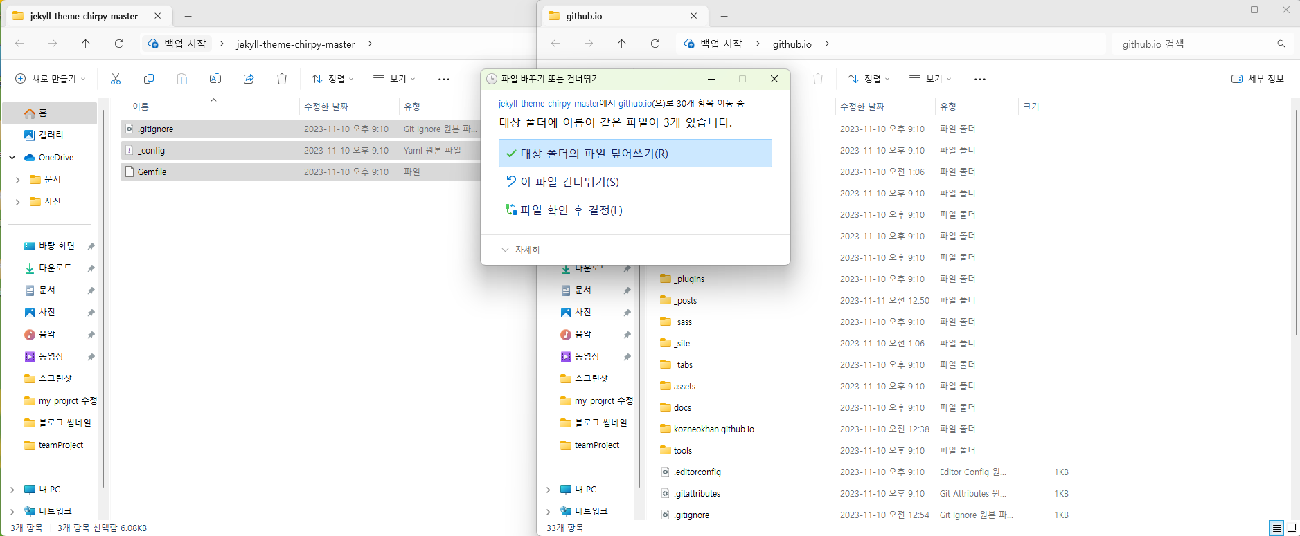 ** chirpy zip의 다운로드가 완료되면 압축을 해제하고 폴더 안에 있는 파일 전부를 clone 받았던 로컬 Repository에 붙여넣습니다. (이미 같은 이름의 파일은 중복 경고를 무시하고 덮어쓰기를 진행하시면 됩니다.)