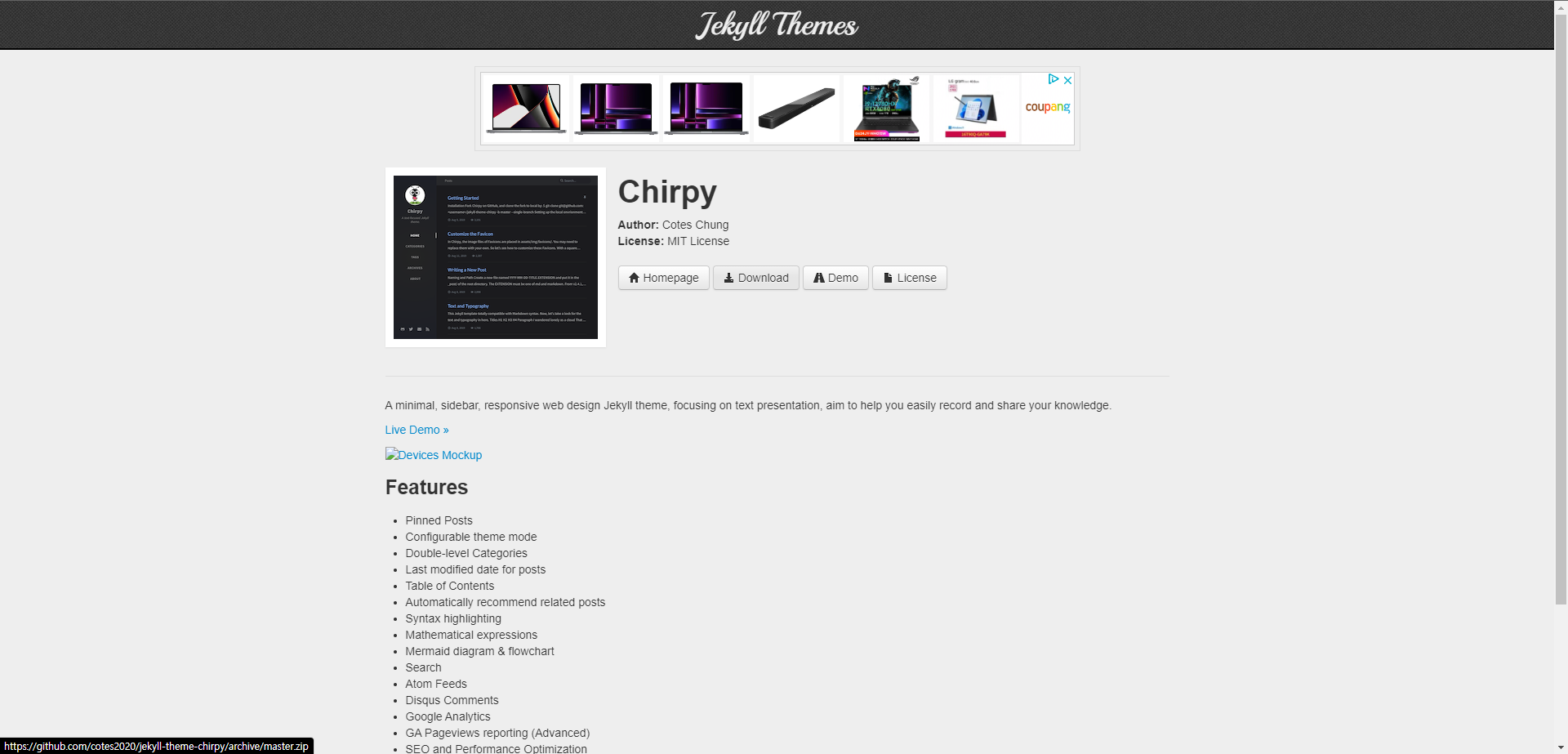 위에 사이트로 이동하여 Jekyll에서 지원하는 테마를 먼저 선택하고 Download 버튼을 클릭하여 ZIP 파일을 다운로드 합니다. 저의 경우 가장 인기있는 테마인 chirpy를 선택했습니다.
