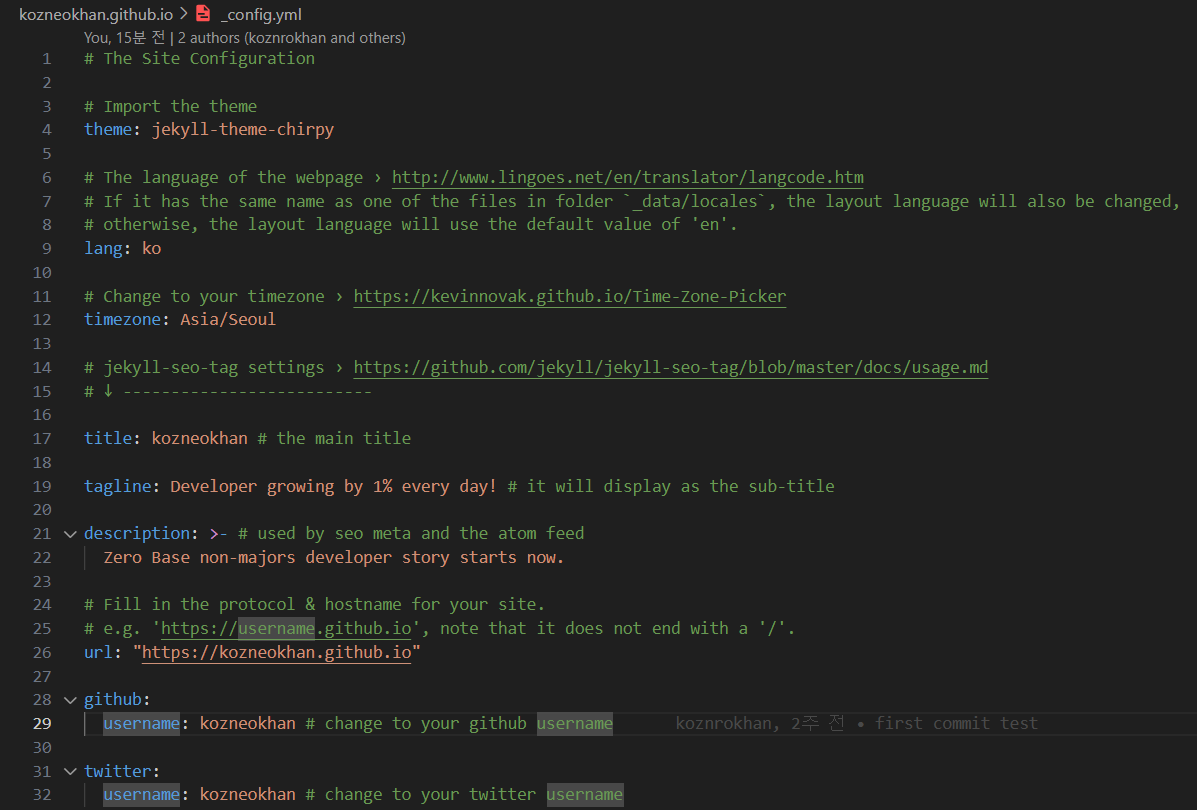 이제 default로 설정되어 있는 _config.yml 파일을 열어서 기존 코드를 자신의 환경에 맞춰 수정합니다.