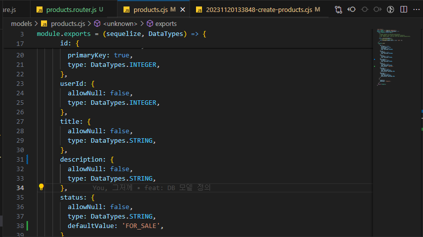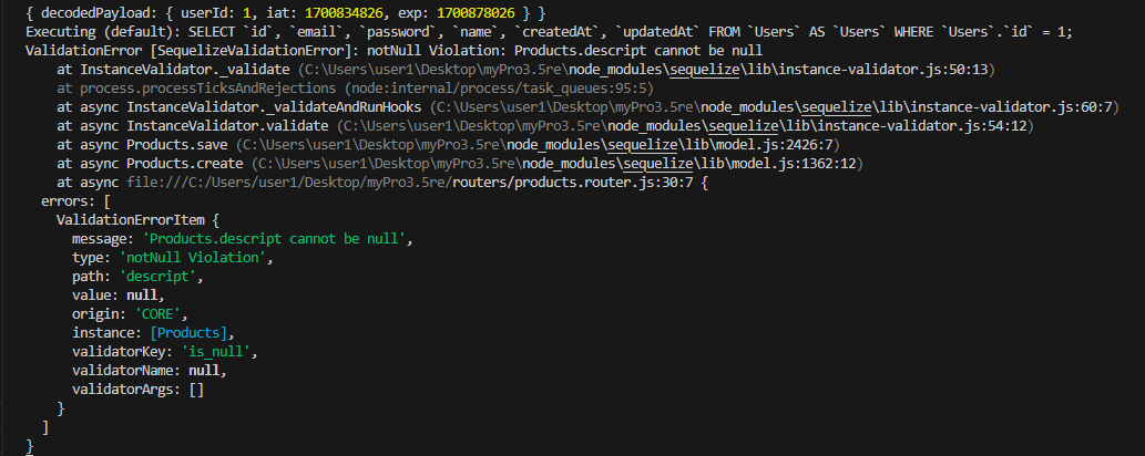 오류 메시지를 살펴보면 'Products.descript cannot be null'이라는 메시지가 보입니다. 여기서 오타가 있는 것으로 보입니다. 데이터베이스 마이그레이션 파일에는 description 필드가 있지만, 오류 메시지에는 descript가 나와있습니다.