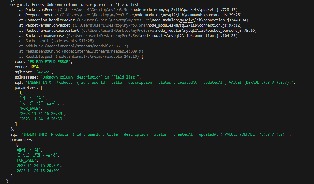 오류 메시지인 'Unknown column 'description' in 'field list'는 데이터베이스에 Products 테이블에 description 컬럼이 존재하지 않아서 발생한 것으로 보입니다. 이를 해결하기 위해서는 Sequelize 모델과 데이터베이스 스키마를 동기화해야 합니다.