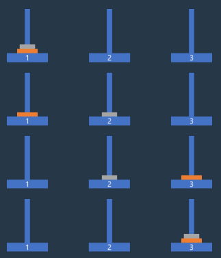 2) 1개가 아닌 여러 개의 원반을 옮기기 위해서는 다음과 같은 단계를 반복합니다.