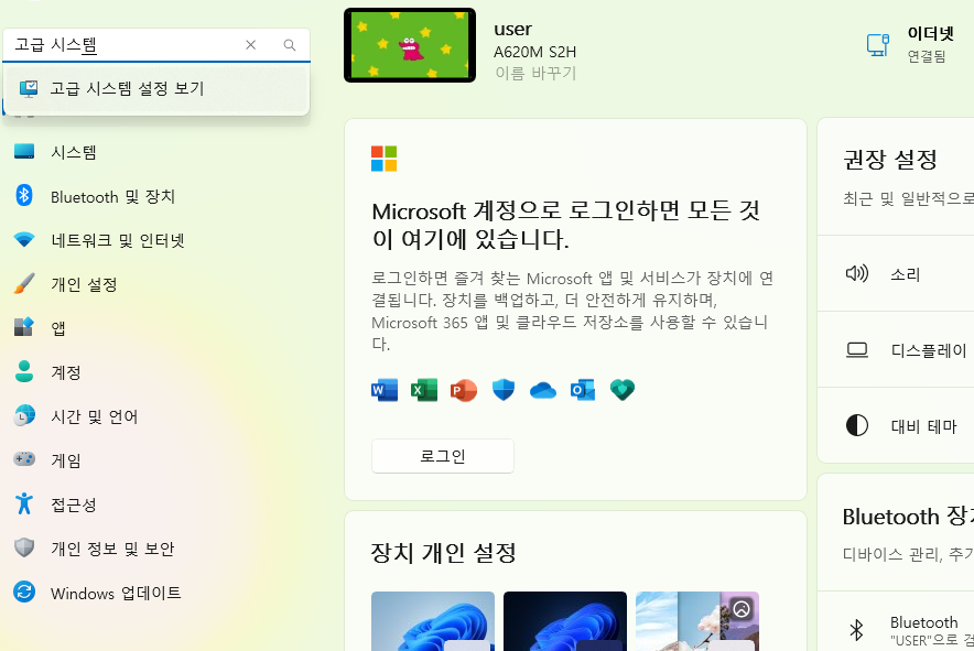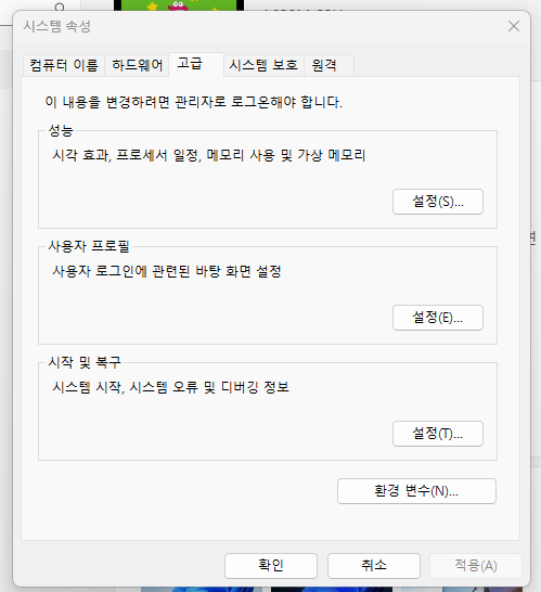 제어판에 들어가 시스템 및 보안 > 시스템에서 [고급 시스템 설정]을 클릭합니다.