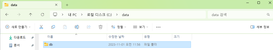 내PC/C드라이브에 data라는 폴더를 만들고 db라는 폴더를 생성합니다.